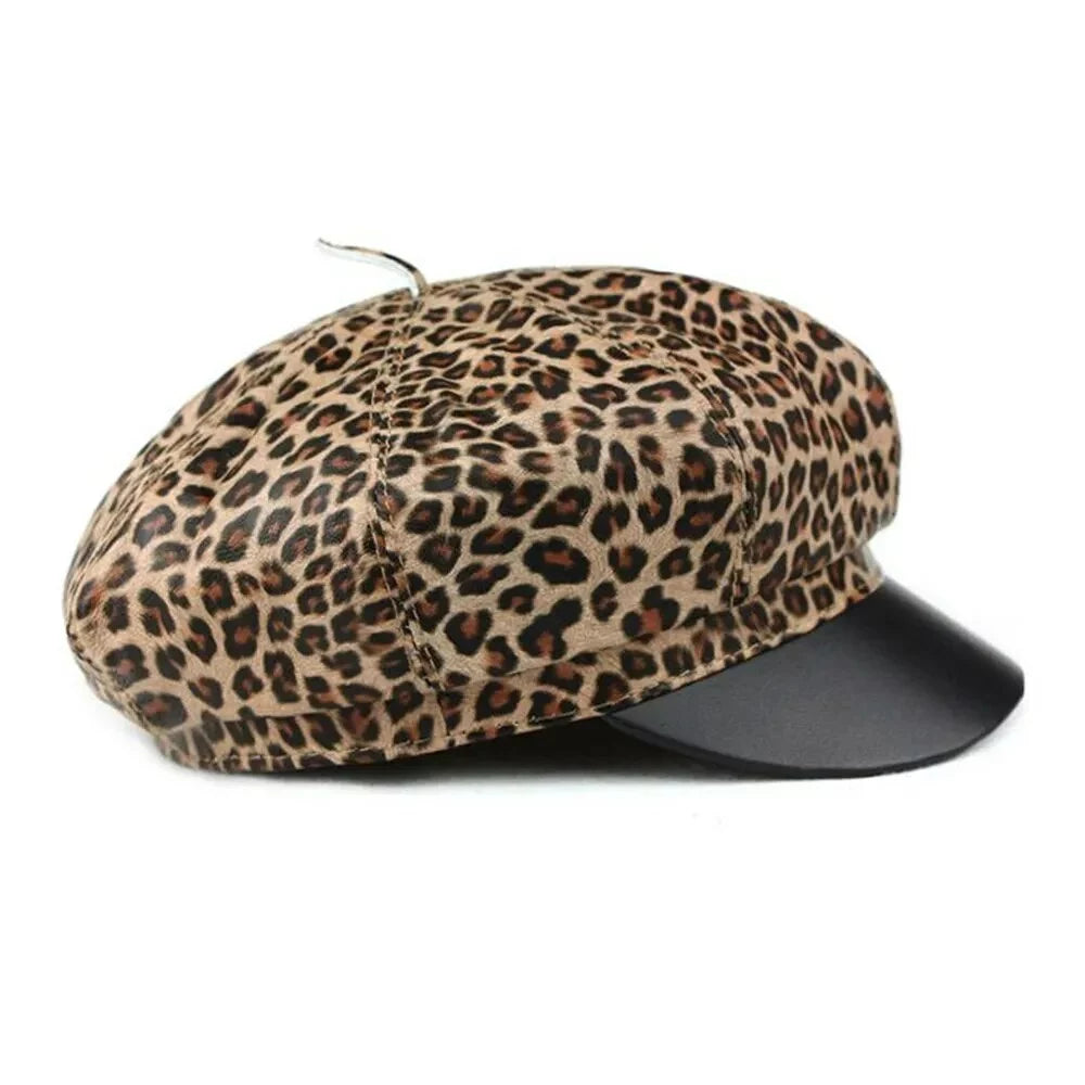 Women Leopard Leather Newsboy Cap